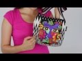 Laurel Burch Blossoming Feline Crossbody Tote - This Blossoming Feline Crossbody Tote Laurel Burch bag is part of the Folklorica Collection from Laurel Burch. A Purple Feline with Flowers Cat is in the center of Flowery Blossoms in a garden of color and cheer. Native black and white Zig Zags are the background for Laurel Burch's fabulous colorful art. It has an inner zipper pocket and separate interior cell phone pocket. Blossoming Feline Laurel Burch tote brings color and style by displaying Laurel Burch's wonderful practical art. There is a zipper top closure and adjustable shoulder strap, and it measures approx 10 1/2" Wide x 9" High x 2" Deep.